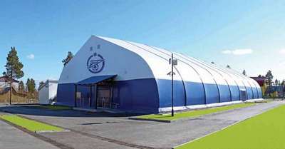 Традиционная для капитального строительства форма здания в виде прямоугольной «коробки» с покатой крышей, где вместо стен используется натянутое тентовое полотно.