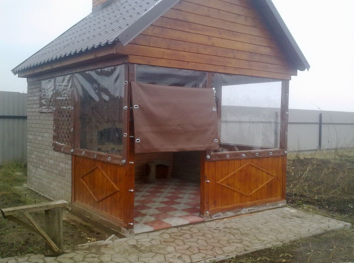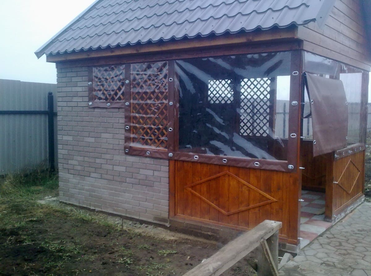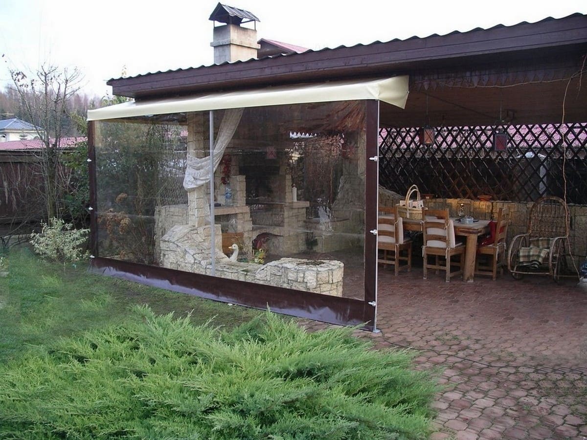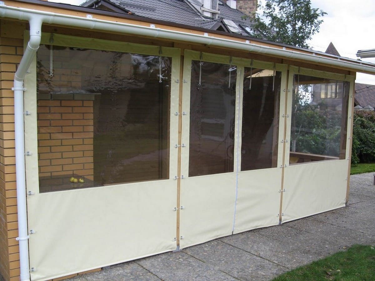 Данные укрытия легко очищаются, укладываются или сдвигаются в виде штор для беседок и веранд укроют от ветра, дождя как во время пребывания, так и для защиты во время не пользования. Беседки можно сделать и глухими, то есть с плотно закрытыми щелями и морозоустойчивыми стенами, одним входом, который может открываться пологом — этот вариант пригодится как подсобка.