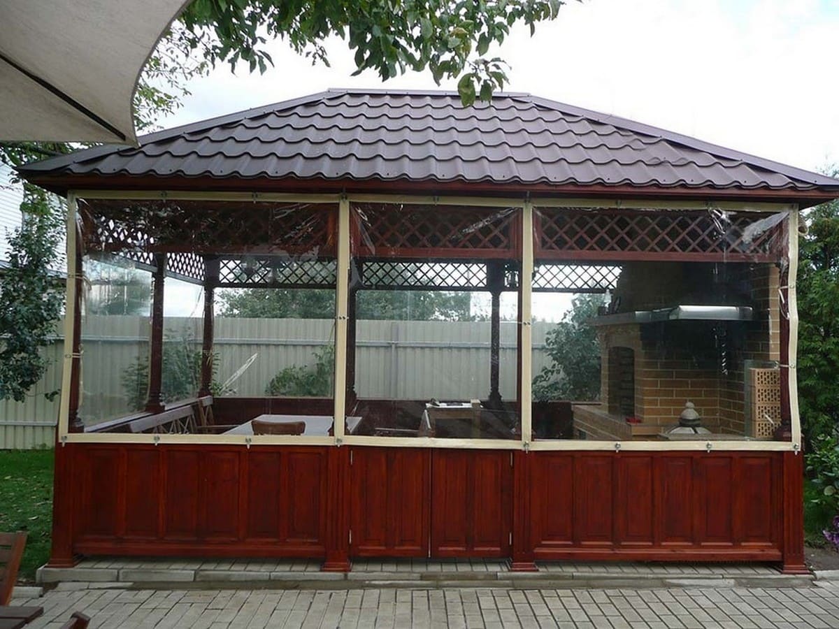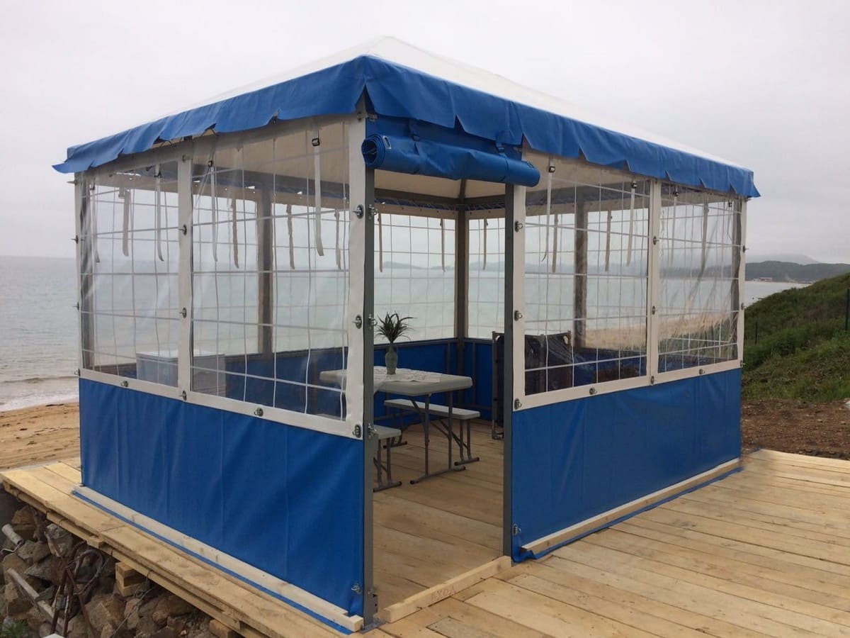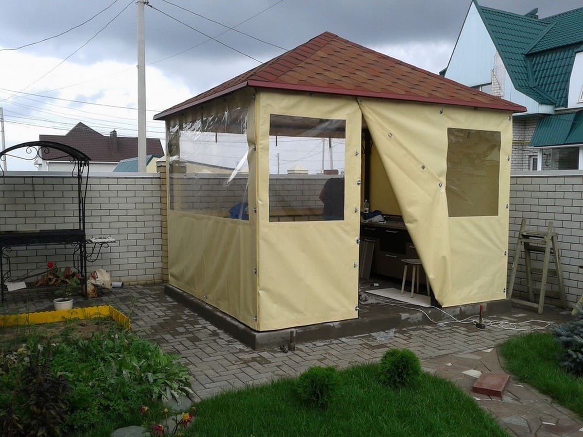 Данные укрытия легко очищаются, укладываются или сдвигаются в виде штор для беседок и веранд укроют от ветра, дождя как во время пребывания, так и для защиты во время не пользования. Беседки можно сделать и глухими, то есть с плотно закрытыми щелями и морозоустойчивыми стенами, одним входом, который может открываться пологом — этот вариант пригодится как подсобка.