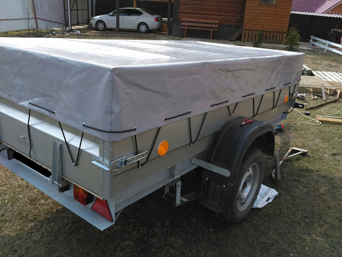 Тент-полог или тент-накидка – это плотный материал с загибами, которые крепятся к бортам прицепа. Такой бюджетный вариант тента для легкового прицепа служит надежной защитой от механических повреждений и укрывает от перепадов температур, сменяющихся погодных условий как: постоянный ветер, сильный дождь, снег и град. Наличие каркаса не требуется, это делает тент легким в применении и практичным. Но следует знать, что такой полог имеет один недостаток: по центру скапливается осадки. Это практичное и бюджетное решение.