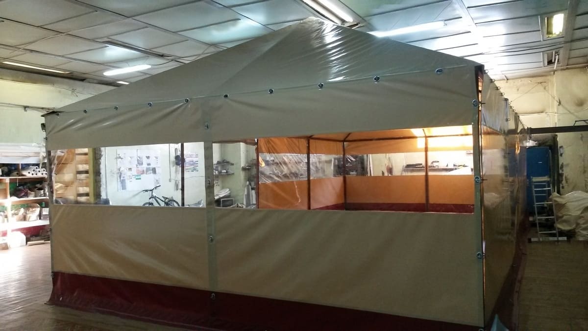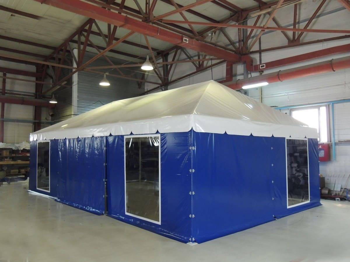По размеру это могут быть как малые одинарные палатки, так и большие каркасно-тентовые композиции, представляющие собой более сложные и развернутые конфигурации.